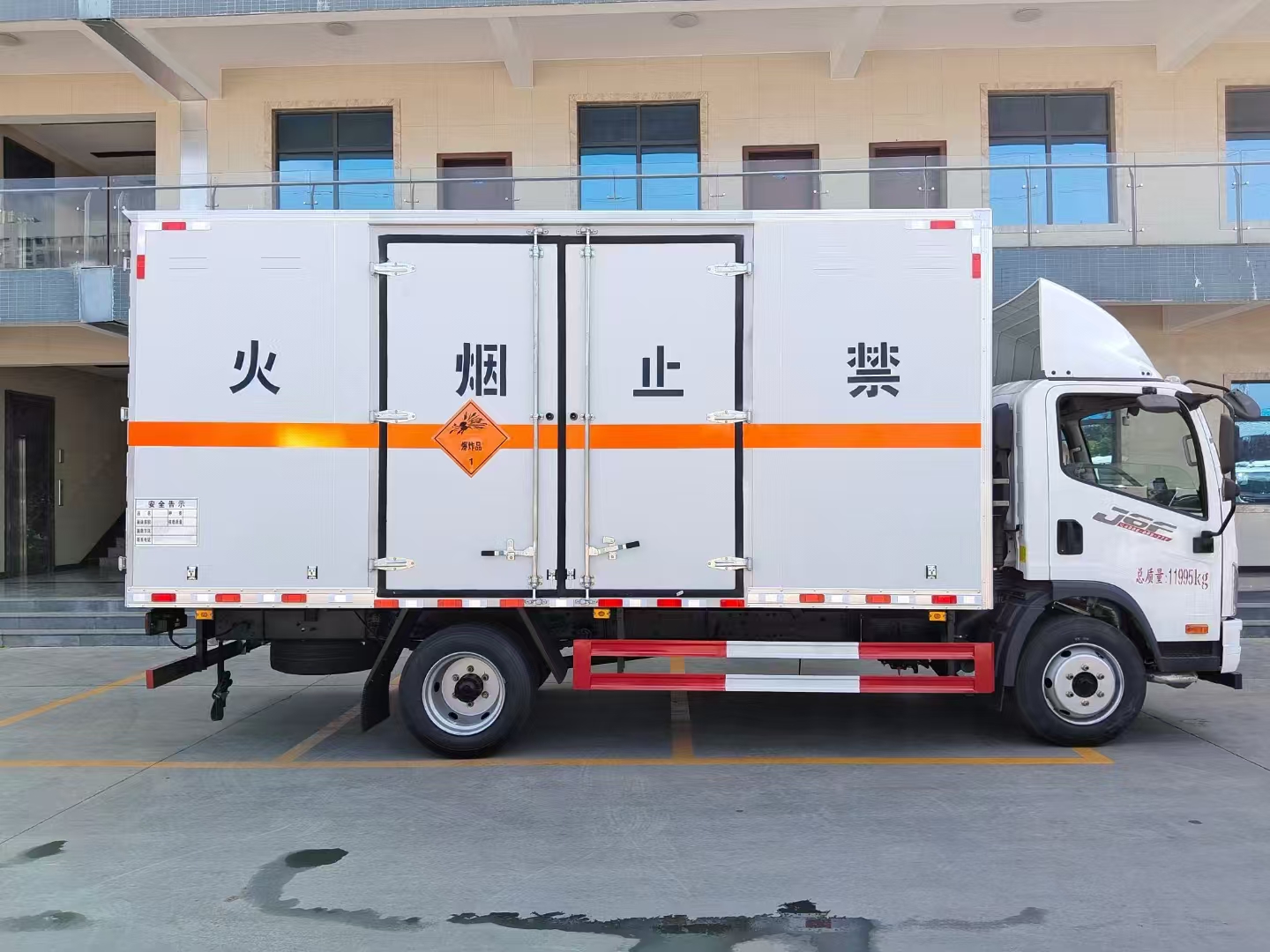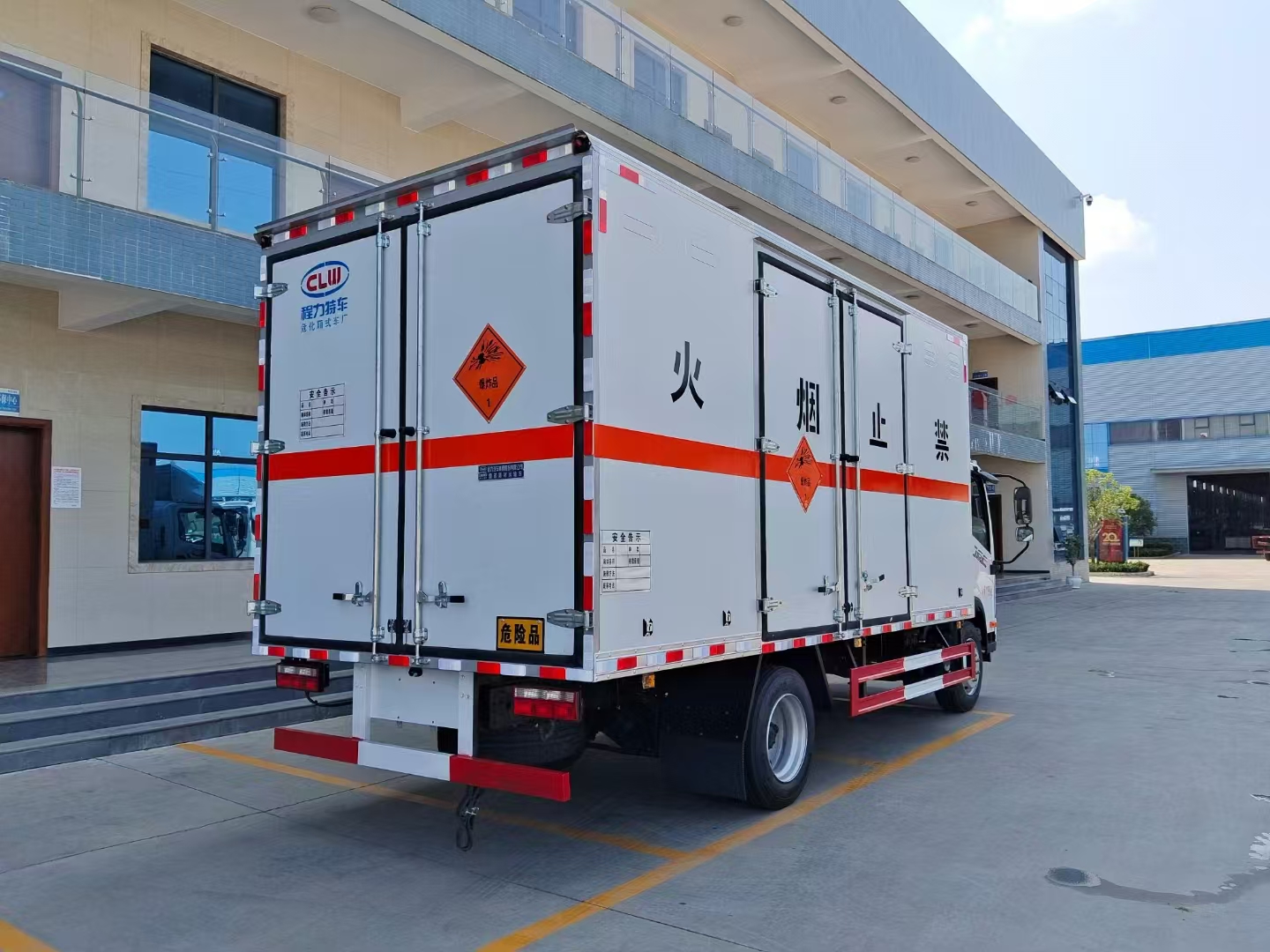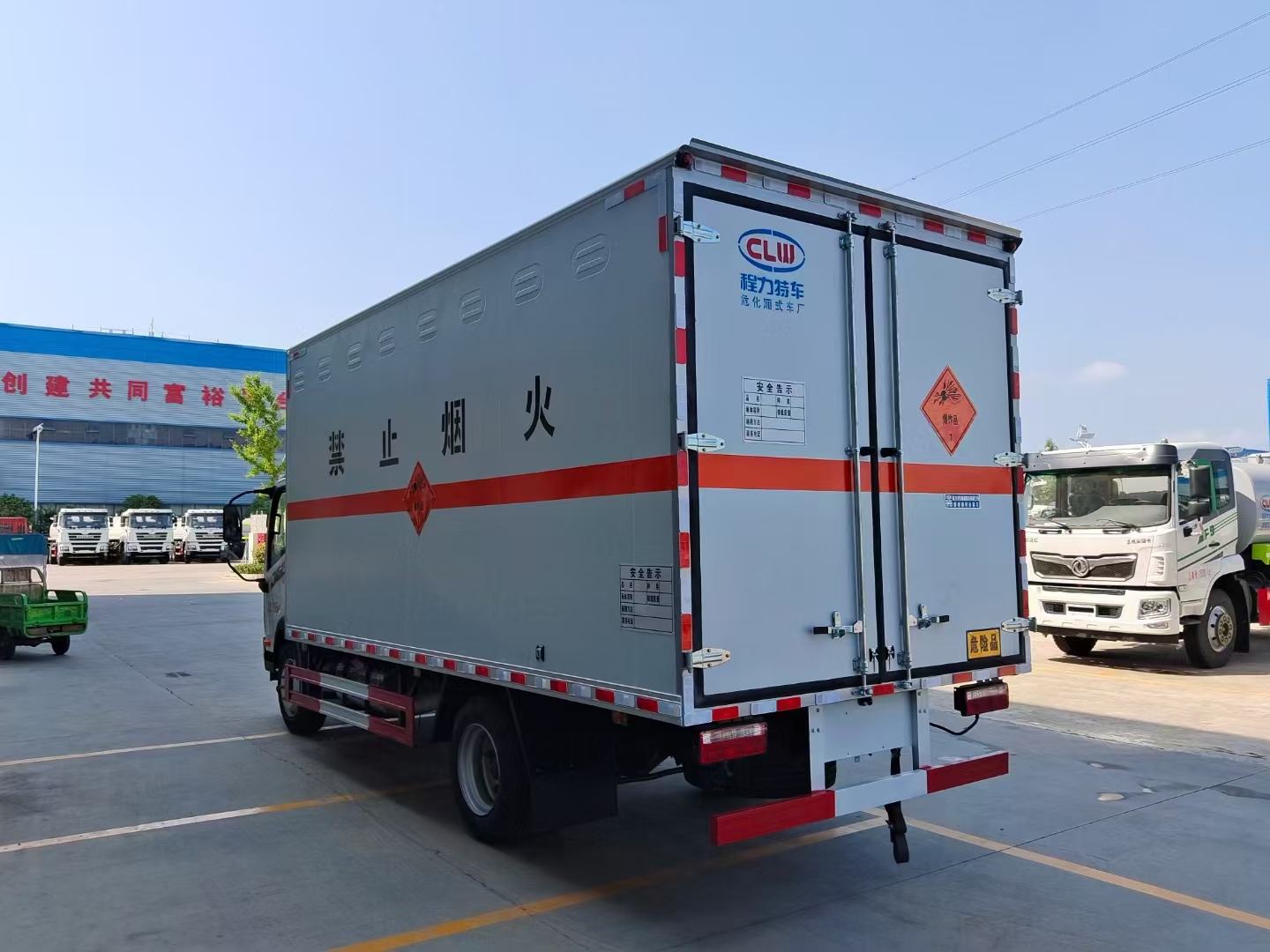 | 貨箱配置 | 廂體為雙層金屬骨架結構,外板采用冷軋鋼板,中間填充阻燃泡沫,內飾為鋁板。底板為平板上鋪防靜電膠皮。廂內兩側加裝固定貨物臥環(huán),門框帶防盜報警器,頂部帶煙霧報警器,廂體右側選裝側門,隨車配2個滅火器,危險標志牌,防火帽,危險品三角頂燈。 (尾部可選裝液壓升降尾板) | ||