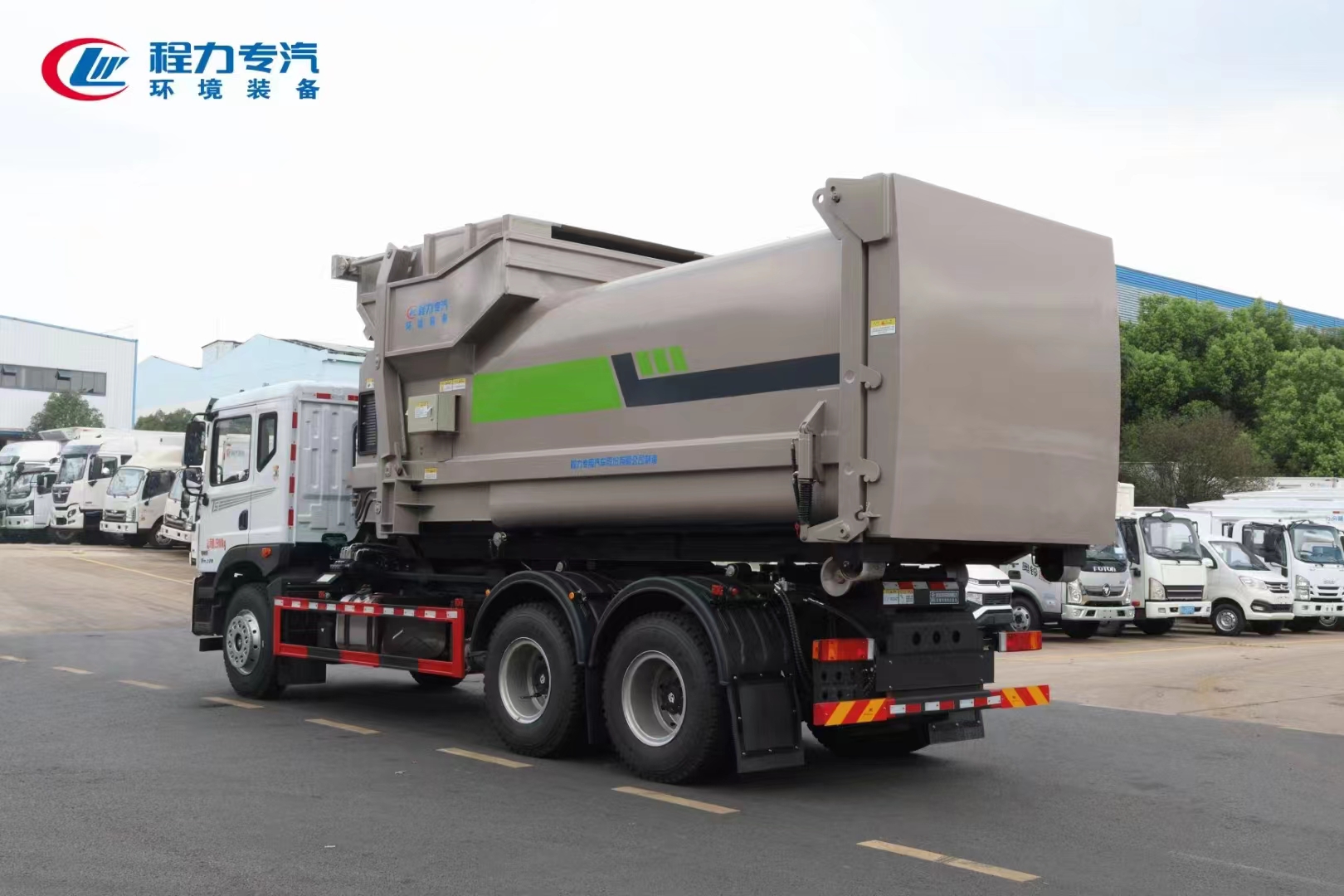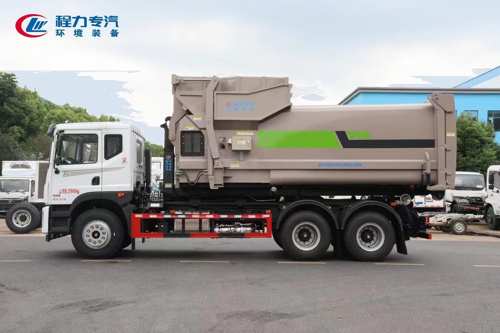 ??????湖北程力汽車:程力專汽東風華神后雙橋勾臂垃圾車+移動壓縮箱產(chǎn)品型號及參數(shù)配置,程力專汽東風華神后雙橋勾臂垃圾車+移動壓縮箱高清圖片,程力汽車系列程力專汽東風華神后雙橋勾臂垃圾車+移動壓縮箱最新報價請撥打客服熱線。車輛主要配置 產(chǎn)品名稱: 程力威牌CLW5253ZXXBHJ車廂可卸式垃圾車 外形尺寸: 828025503170(mm) 排放水平: 國六 貨箱尺寸: (mm) 總質量: 25000(Kg) 接近/離去角: 15/19,15/20,15/21() 額定質量: 14250,14185(Kg) 前懸后...