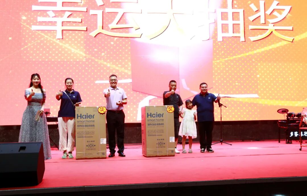 二等獎共2名,由江鈴銷售有限公司副總經(jīng)理李闖(左三)、程力集團(tuán)董事長程阿羅(右一),現(xiàn)場隨機(jī)抽取,并贈送海爾洗衣機(jī)獎品各一臺。