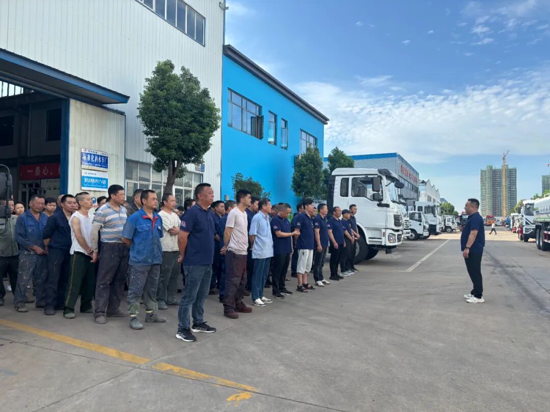 圖一(上):七月初以來(lái),程力專(zhuān)用汽車(chē)股份有限公司總經(jīng)理成向陽(yáng)帶領(lǐng)黨員模范先鋒班組,每天清晨6:00點(diǎn)鐘,準(zhǔn)時(shí)開(kāi)早會(huì)宣誓鼓舞干勁。